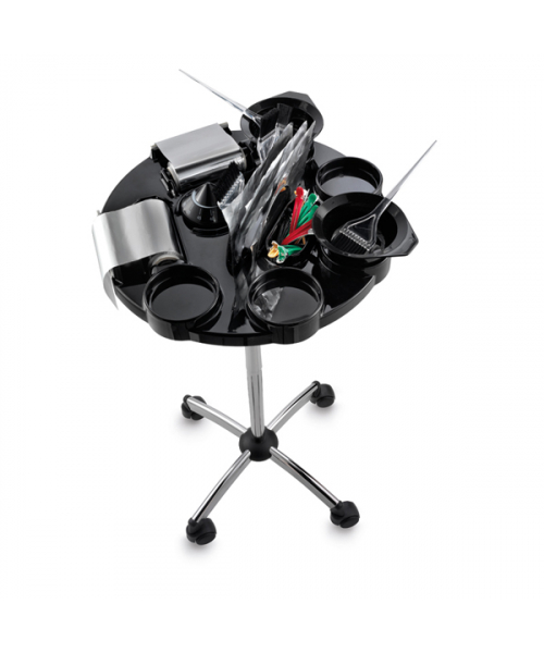 Тележка для окрашивания "TINTO" - из пластика на колесах. Имеет 5 отделений под миски для окрашивания, 5 отделений под кисти, 2 держателя с резаком для фольги, отделение для таймера TIMER DRINN и контейнер для сопутствующих аксессуаров.