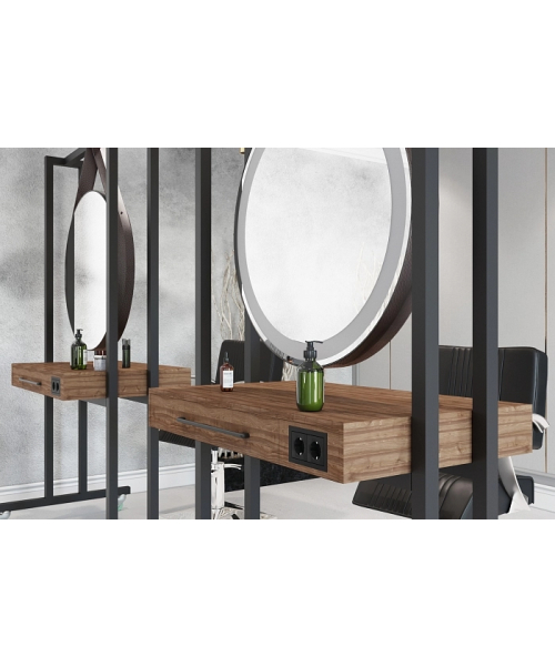 Металлический корпус, покрытый порошковой краской, вместительная столешница, ящики с каждой стороны для удобного хранения парикмахерских принадлежностей. Прорезиненные профессиональные колёса и возможность оборудования розеток для электроинструмента, обеспечивают высокую мобильность и удобство работы.