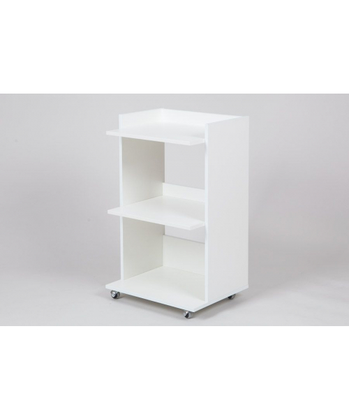 Столик косметолога три полки на колесах. Удобный косметологический столик-тележка с тремя полкапи, ограниченными бортиками с трех сторон. Расстояние между полками 33 см. позволяет ставить высокие флаконы с косметологическими средствами. Влагостойкое ламинированное ДСП порзволяет протирать и обрабатывать столик дез средствами.