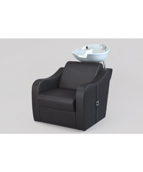 Подстраиваясь под клиента, раковина поднимается и опускается, принимая нужное положение. Стильное основание изготовлено с эргономичной спинкой и удобными мягкими подлокотниками, сиденье – широкое: все для того, чтобы клиенту было максимально комфортно. Боковая часть оформлена элегантным ремешком с пряжкой, по краю материал оформлен качественной строчкой – эти нюансы делают модель красивой и современной, моментально привлекая внимание посетителей.