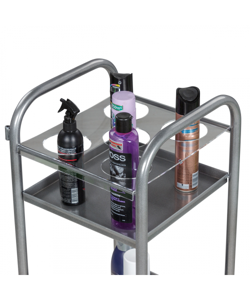 Парикмахерская тележка включает 2 полки, на которых предусмотрено по 5 отверстий для высоких флаконов. Верхние панели над полками съемные, поэтому данную модель можно использовать как обычную тележку. В конструкции нет боковых стенок, благодаря чему можно воспользоваться необходимыми средствами с любой стороны. Наличие вращающихся колес позволяет легко и плавно перемещать парикмахерское оборудование по рабочей зоне. Передвигая тележку, можно не переживать за напольное покрытие, так как колесики из пластика не повредят его.