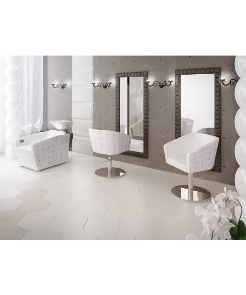 Парикмахерское кресло "Гламрок" с полкой состоит из большого зеркала и небольшой красивой полки, которая отделяет от нижней декоративной части. Цвет прошивки вы можете выбрать самостоятельно – в нашем интернет-магазине вы найдете огромный выбор разнообразных фактур, начиная с блестящей черной или белой экокожи и заканчивая обивкой под дерево.
