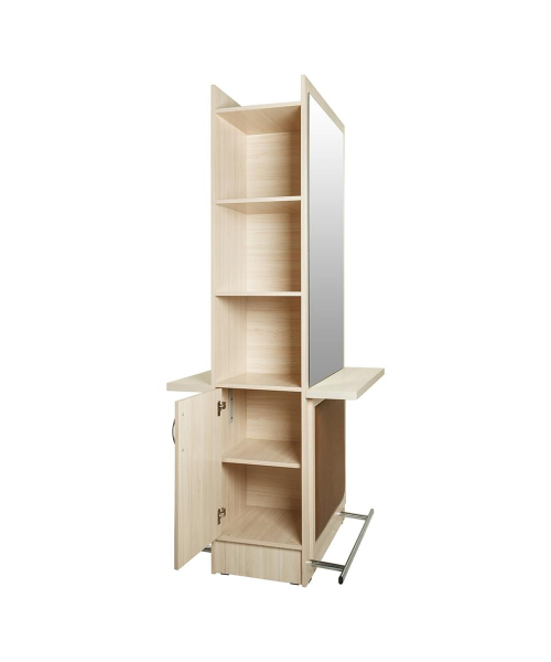 Справа и слева между зеркалами размещены стеллажи с открытыми полками и ящиком