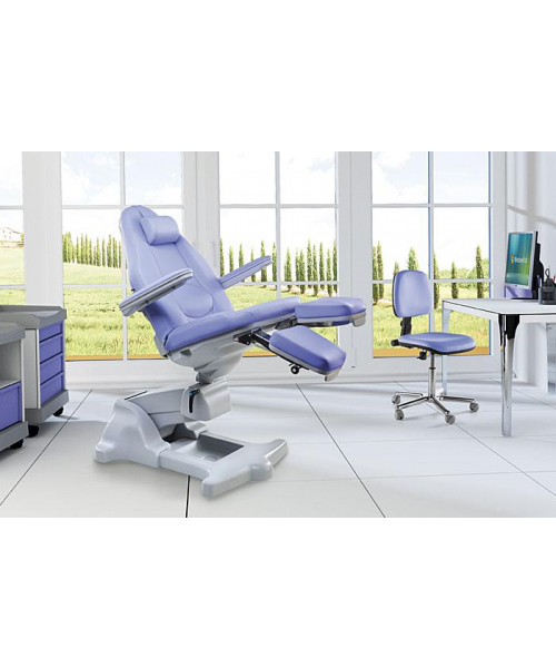 Педикюрное кресло на электроприводе с тремя моторами, имеет ножной пульт управления для регулировки высоты, угла наклона кресла и спинки. Клиент может удобно сесть в кресло благодаря его минимальной высоте, составляющей 49 см, а мастер работает в условиях максимального комфорта, имея возможность выполнять процедуры сидя или стоя: максимальная высота кресла составляет 101 см. Под заказ.